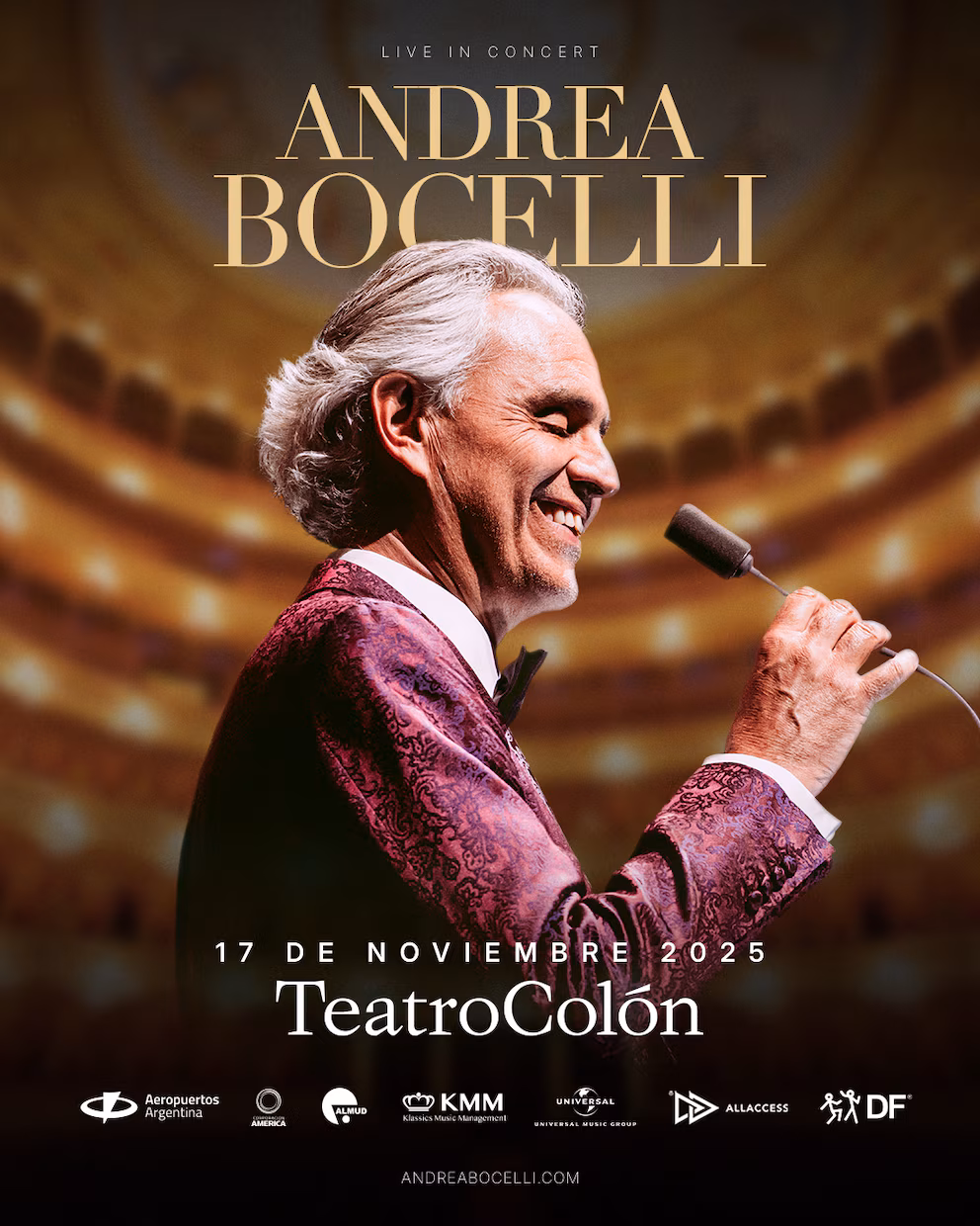 Con más de 30 años de trayectoria, el aclamado tenor italiano Andrea Bocelli brindará una velada íntima dedicada a la música clásica el próximo 17 de noviembre, acompañado por una orquesta en vivo, en un entorno sin igual: el Teatro Colón de Buenos Aires.